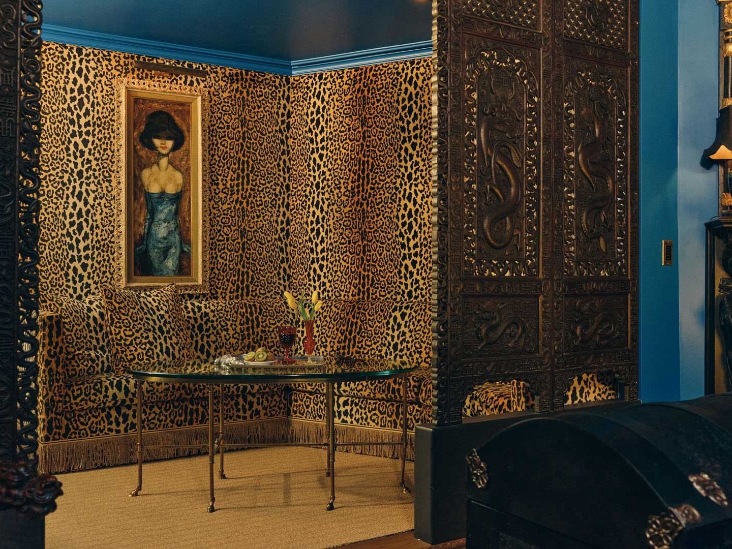 The 550-square-foot Grand Belle Terrace is a maximalist, art-forward suite conceived by Dana Hollister. French doors open to a private terrace with an outdoor fireplace, extending the interior’s layered textures and handmade detailing into the open air. A marble bathroom with a stand-alone bathtub, a gilded fireplace, concealed TV lift, and custom bar complete a space that feels theatrical yet deeply private.